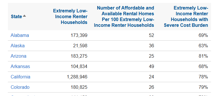 A crucial aspect of low-income housing is rentals. Currently, 34% of Americans – almost fully a third – rent their homes. Nearly half of these renters are extremely low income, meaning they either fall below the federal guideline for poverty or make less than 30% of the area median income. For every 100 extremely low income households, only 35 affordable and available rentals exist for them. This means millions of Americans spend too much of their income on rent, or live in overcrowded and undermaintained units, or even worse, face homelessness.